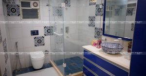 The Moroccan-inspired washroom with modern 3D design gives us the perfect blend of tradition and modernity. The Moroccan-themed basin is perfectly in sync with the white tiles and the most contrasting colour purple of the dresser. The purplish-blue floor tiles of the shower beautifully contrast with the white tiles on the walls.