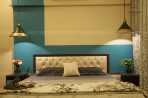 The graceful peacock and the cute tiny glass vases holding the flowers and plants make the bedroom both inviting and calming. The fascinating combination of dual colours on the walls along with the optimal amount of illumination creates the absolutely flawless ambience for a much-needed relaxing shut-eye.